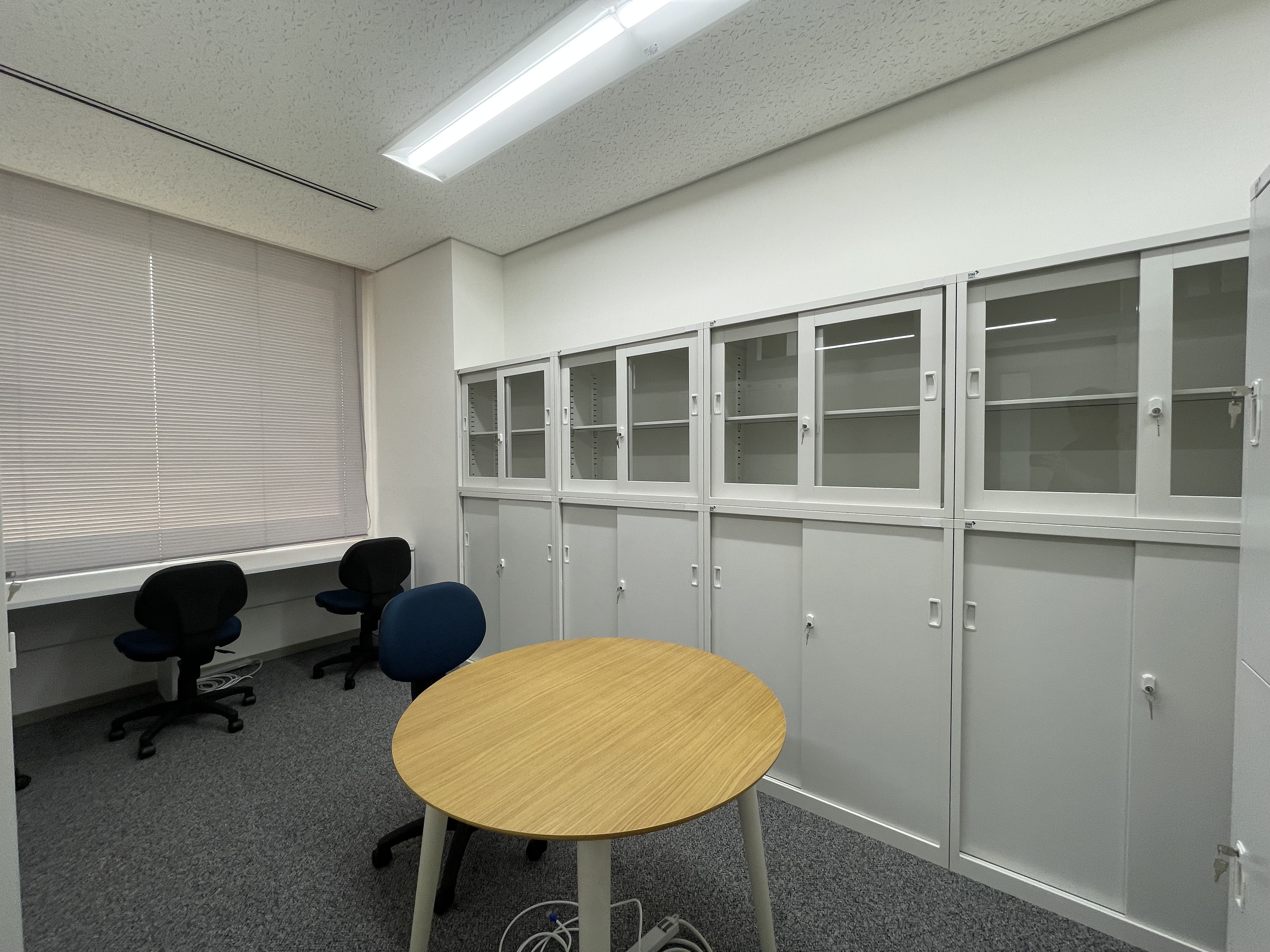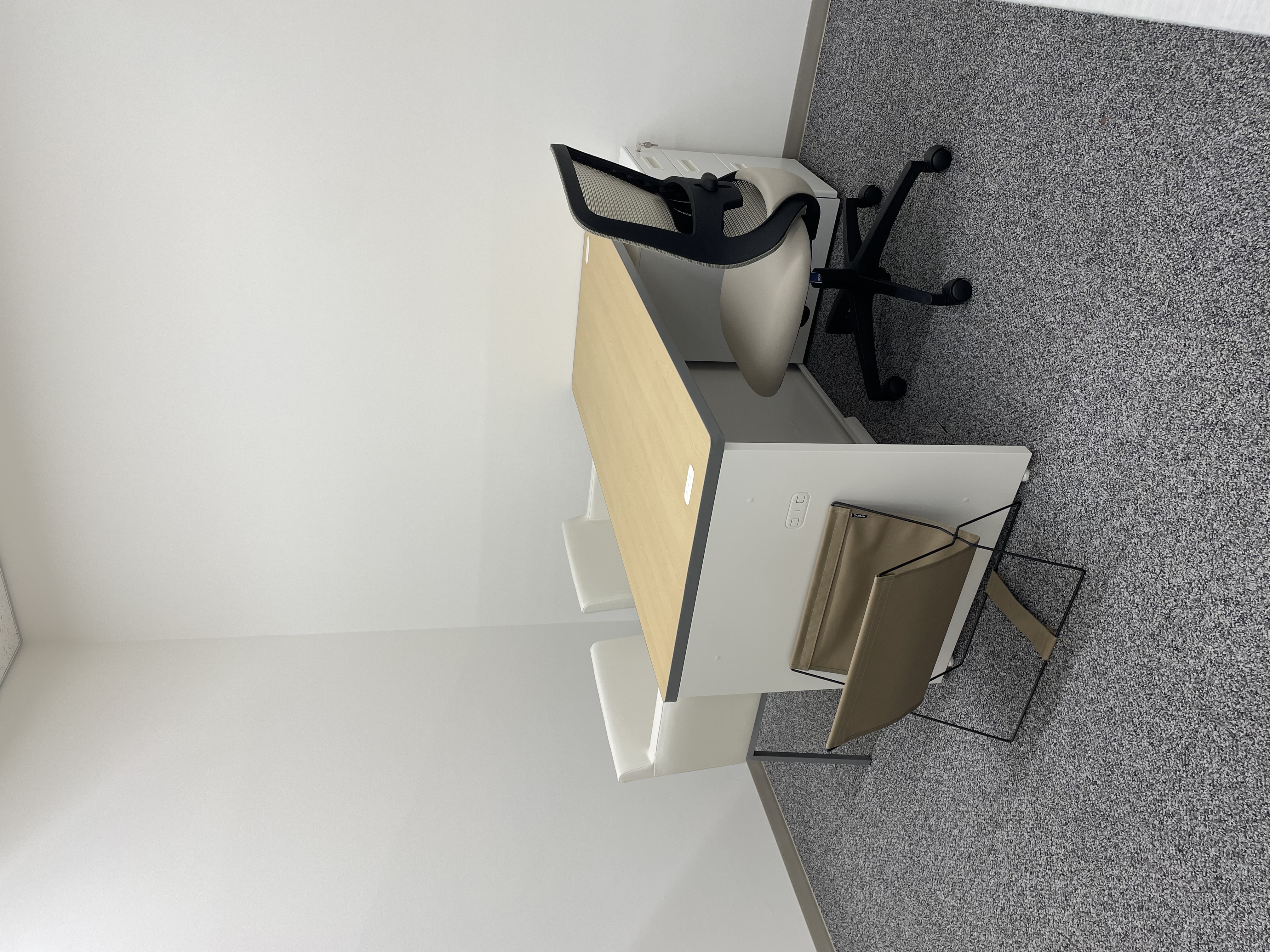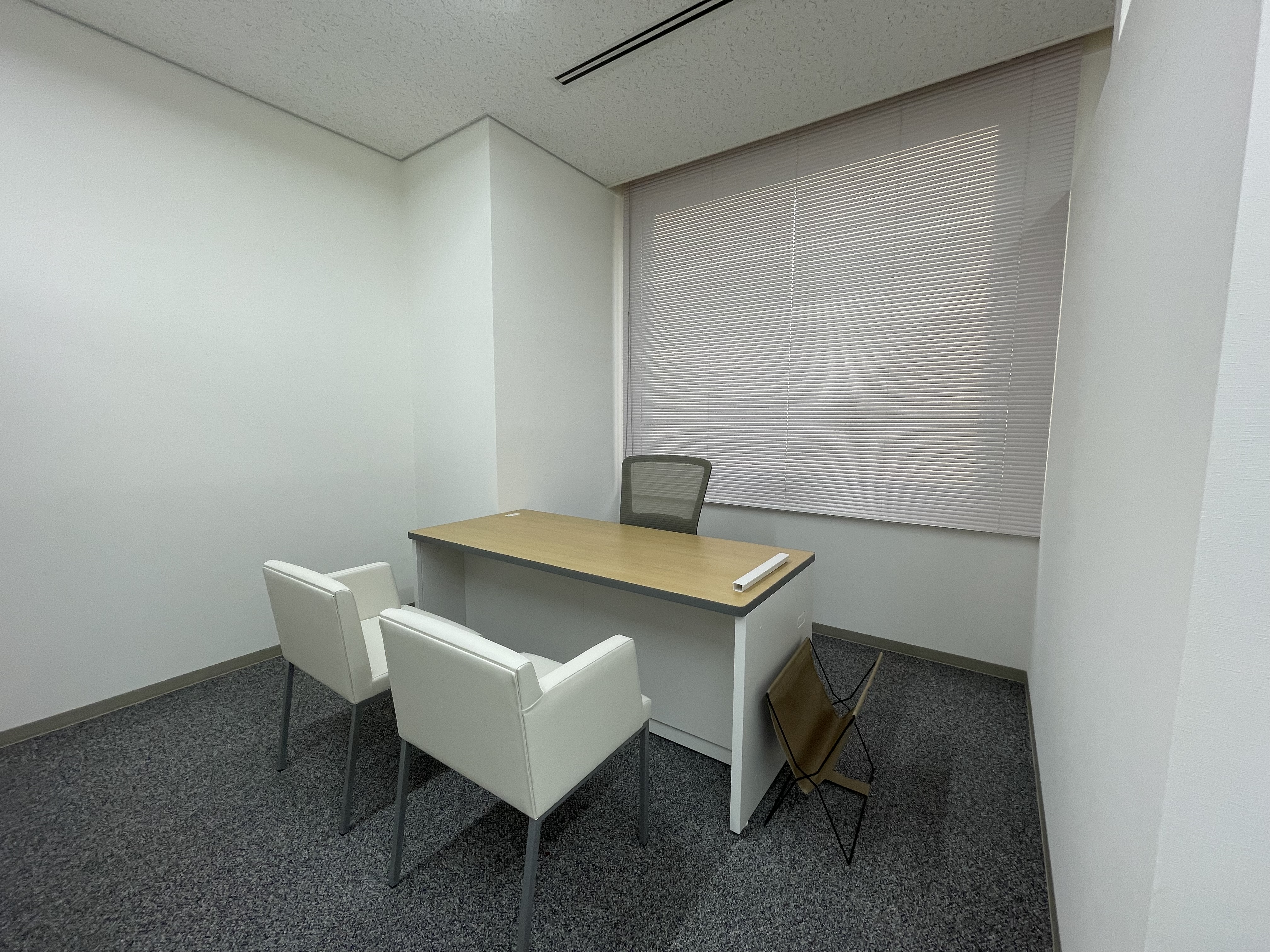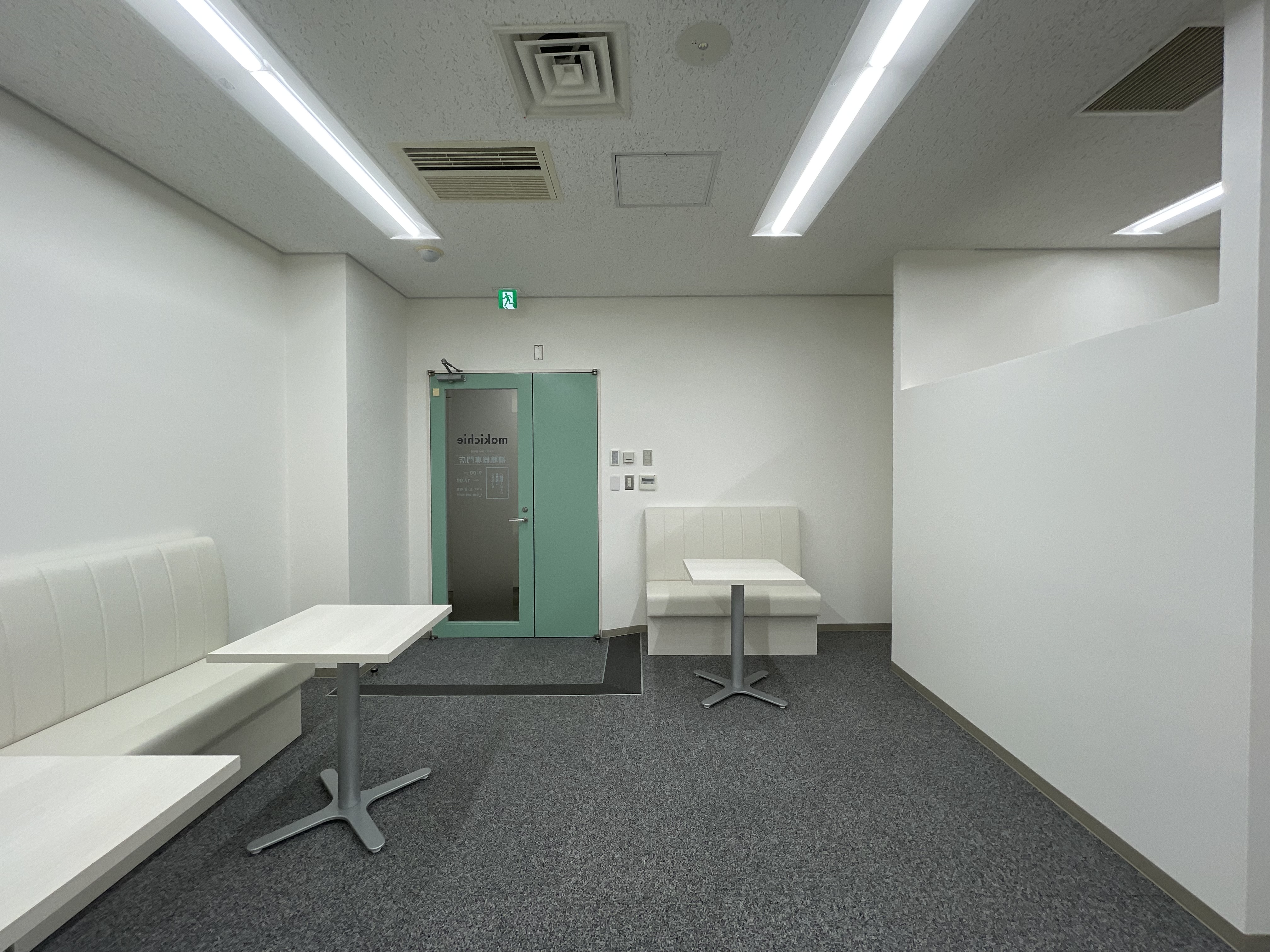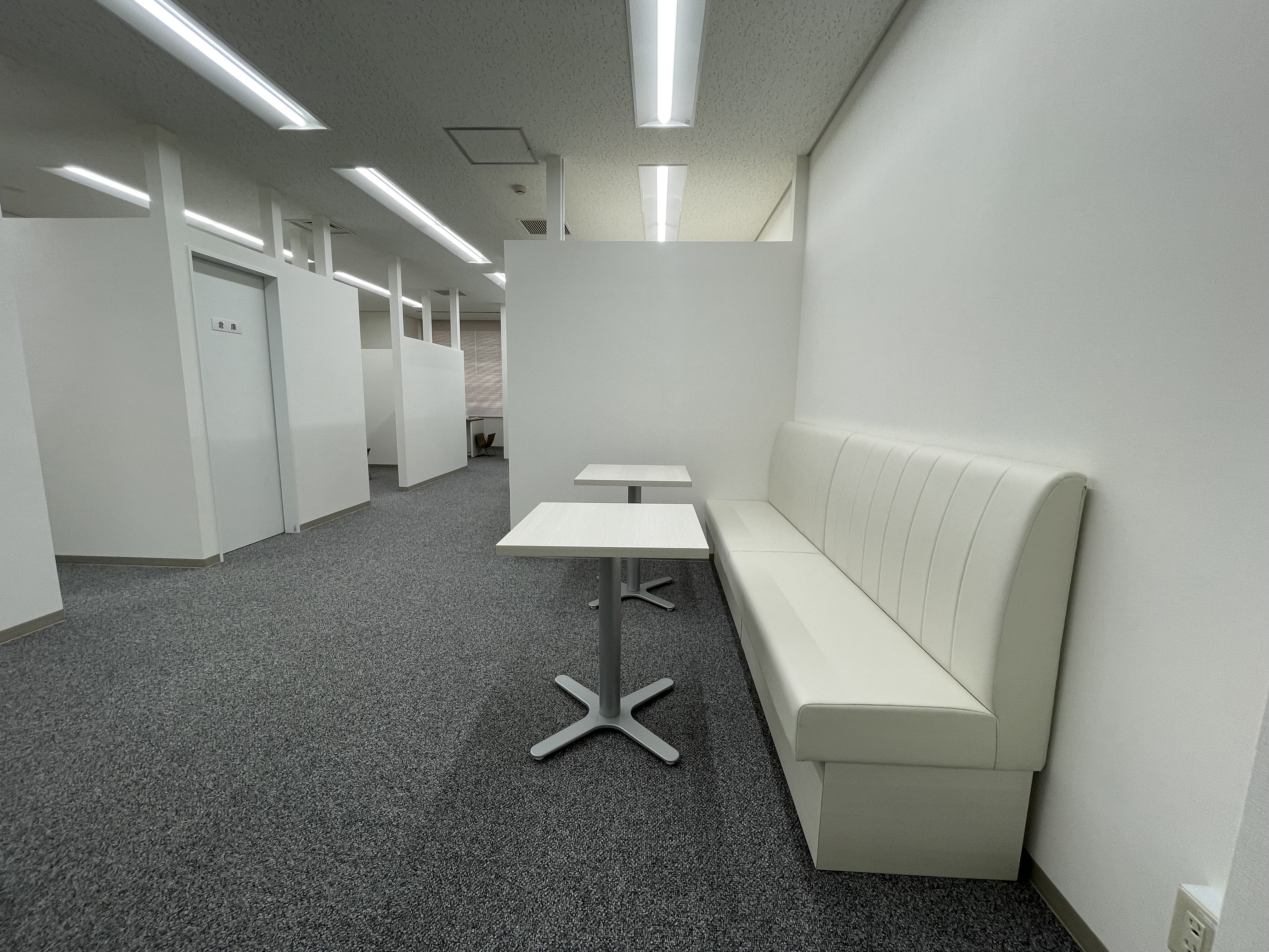 西側の大きな窓より日差しが入り、明るい店内です。接客ブースの間仕切りは1800の高さで押さえ、圧迫感を軽減し、事務及びメンテナンス作業の部屋は、間仕切りを高くして音が直接響いてくるのを抑えています。家具は極力白いものに揃えて、清潔で、少し緊張感のある空間となっています。